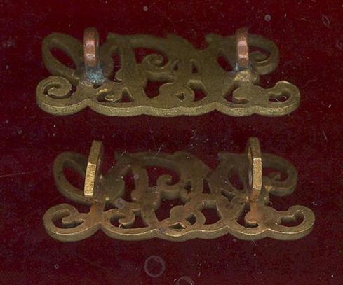 A good post 1920 pair of brass shoulder titles. Two loops/lugs to the reverse of each title. GC.