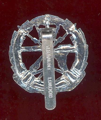 A good silver anodised aluminium cap badge. Slider to the reverse. Made by .J.R.Gaunt, London. VGC.