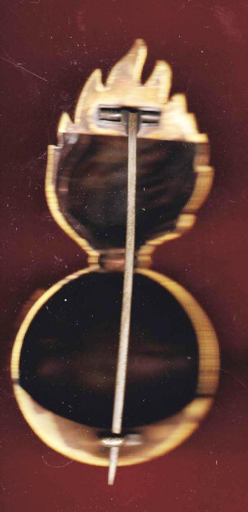 A fine and ultra scarce example worn circa 1902-14. Rich fire gilt flaming grenade with Royal Arms in gilt mounted to the ball. Stout pin to the reverse.VGC. (KK933).