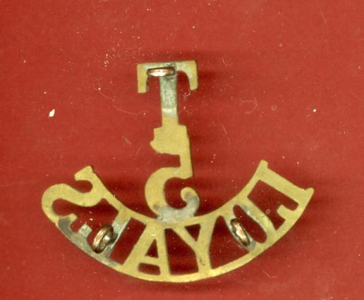 A good scarce post 1920 voided brass metal shoulder title to the 5th Territorial Battalion, Loyal North Lancashire Regiment. Three loops to the reverse. VGC