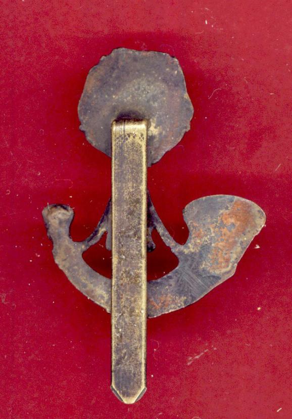 A good scarce die cast blackened brass Rose above strung bugle example. Slider to the reverse. Mounted on red felt oval. VGC.