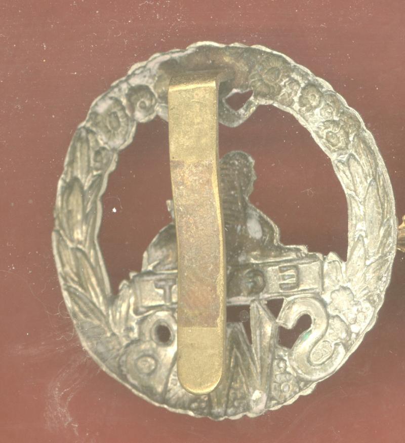 A good later die stamped white metal example worn by Volunteer Battalions up to 1908 and by Territorial Battalions after . Slider to the reverse. VGC
