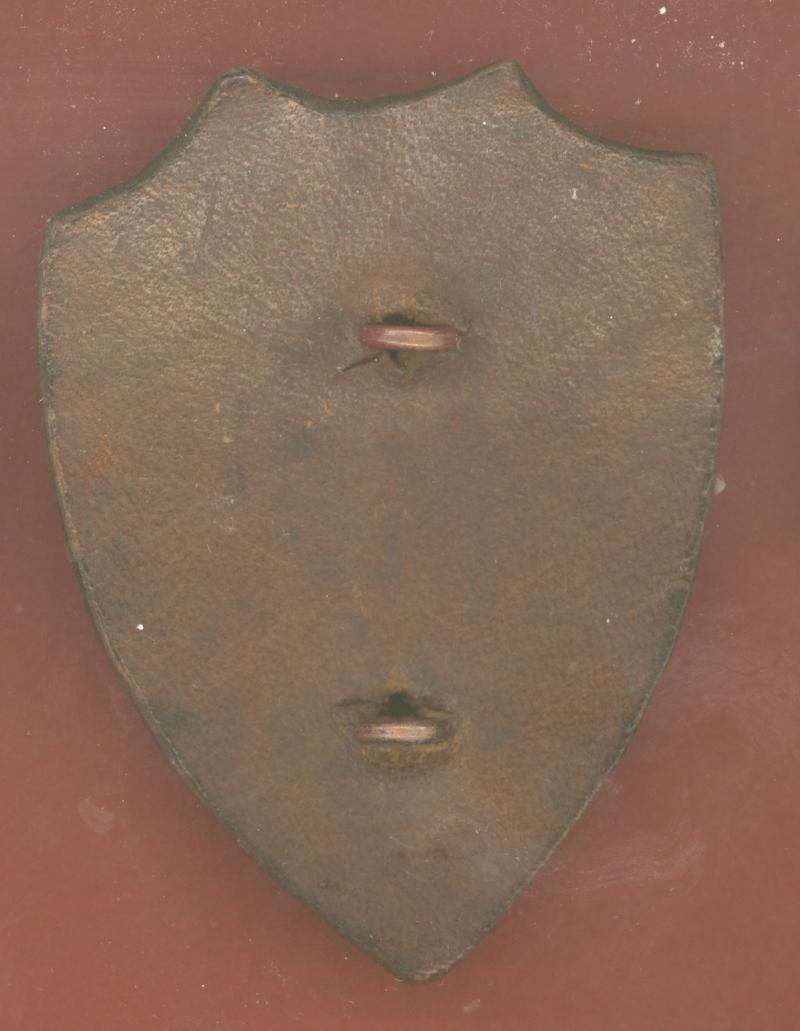 A very scarce pre 1881 die stamped brass example. Two loops to the reverse. On original leather backing. VGC.