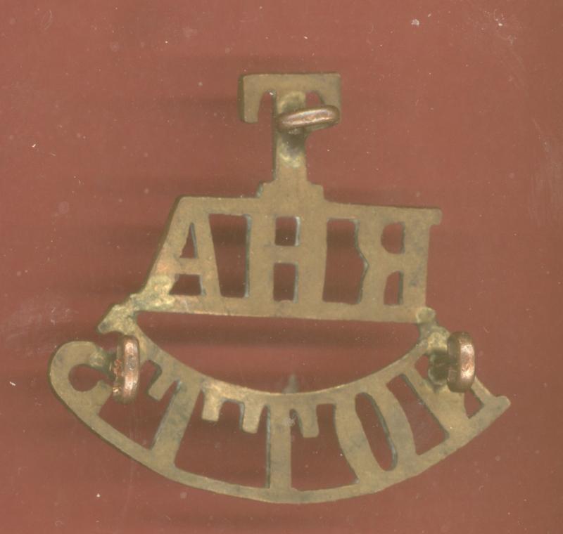 A super scarce Royal Horse Artillery Nottinghamshire brass shoulder title worn circa 1908-20. Three loops to the reverse. VGC. Westlake 592 Nottinhamshire & Derbyshire Mounted Brigade , H.Q. Nottingham.