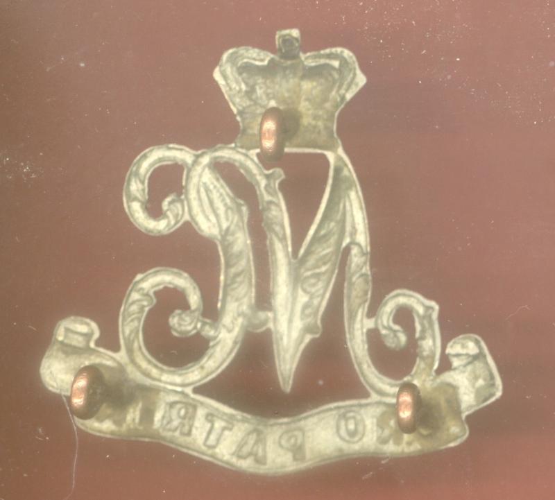 A fine scarce pre 1901 die-stamped white metal crowned floreated NC resting on PRO PATRIA scroll. Three loops to the reverse. VGC. Owen 360