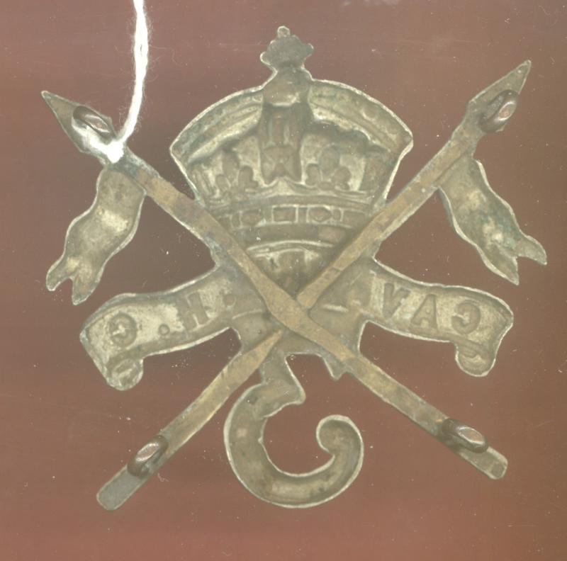 A fine scarce die stamped silver plated example worn circa 1890-1903. Superimposed on crossed lances, an Imperial crowned scroll 'Cavalry H.C.' with large '3' between the base of lances. Four loops toned black to the reverse. VGC.