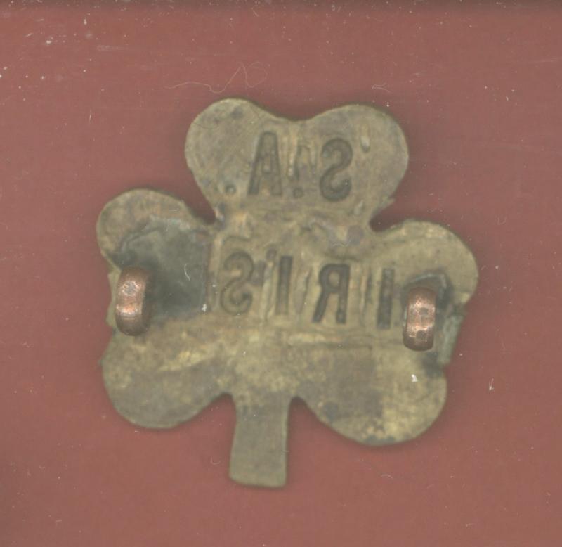 A fine scarce die-stamped sheet brass shamrock inscribed SA over IRISH. Original flat bent round loops replaced . GC. Owen 636
