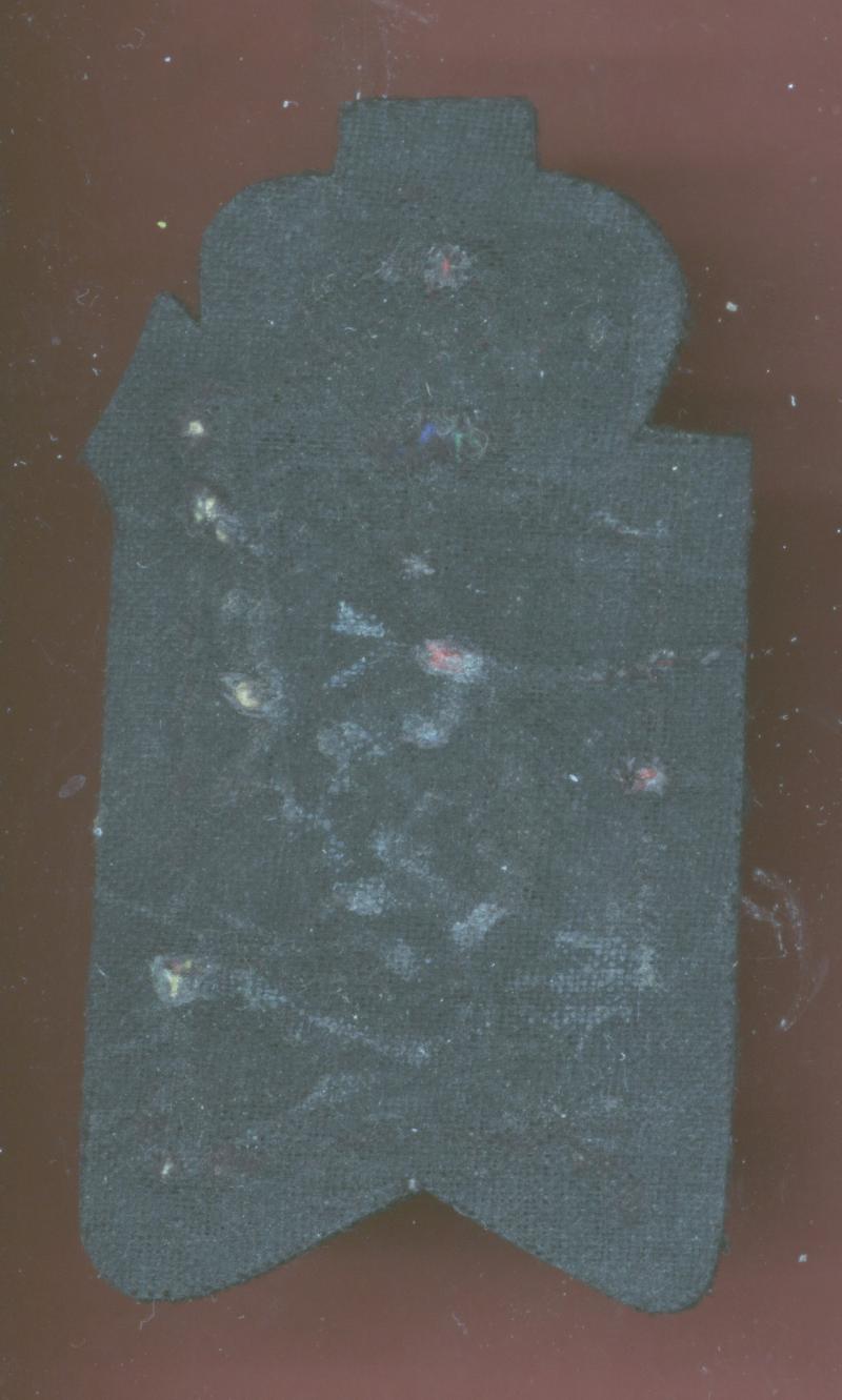 A good post 1953 small pattern gold wire embroidered on maroon cloth. Worn upon small gold stripes. Black felt backing. VGC....