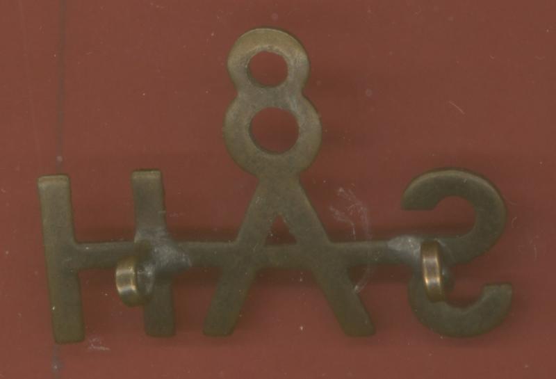 A fine scarce locally made hand cut sheet brass title worn circa 1915-18 by 8th South African Horse. Two loops to the reverse. VGC. Owen 2364....