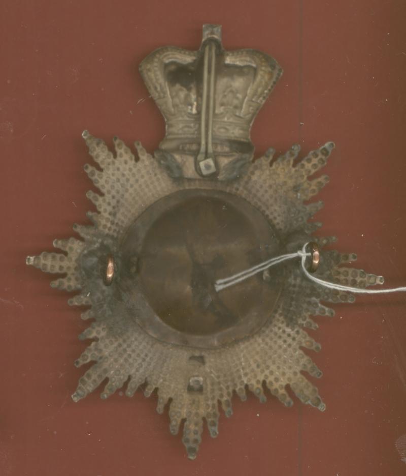 A fine scarce die stamped umarked silver multi part example worn circa 1860. Crowned eight point hobnailed star , inside a strap inscribed '1st Somerset Regt.'; to the centre entwined 'VR'. Bottom scroll inscribed 'Defendemus' Two refixed loops to the reverse. General service wear VGC