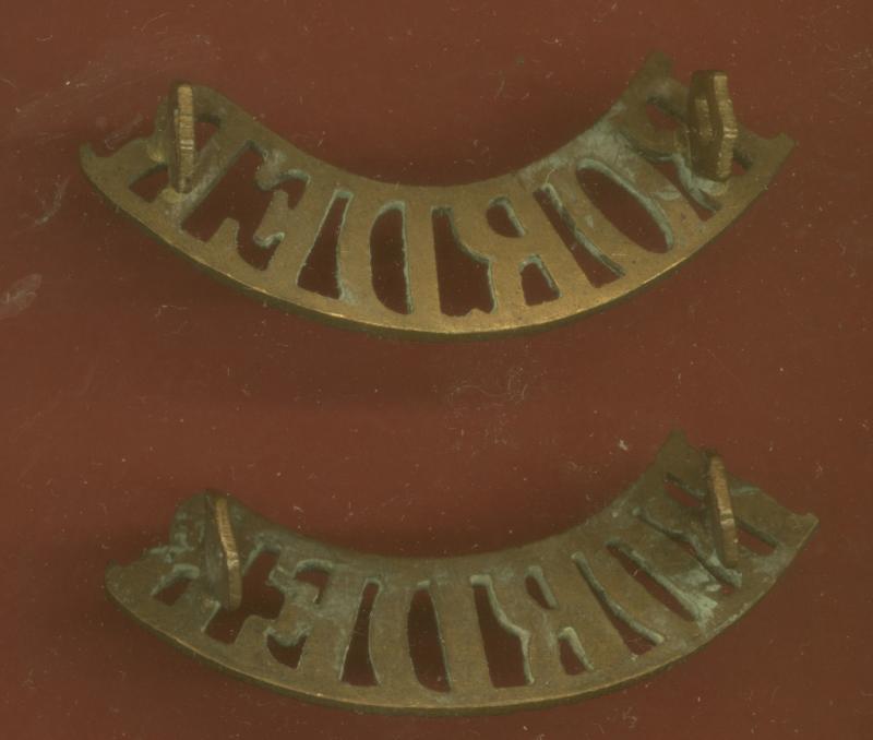 A good scarce pair of brass titles worn post 1902. Two hex type lugs to the reverse of each title. VGC. Westlake 1077
