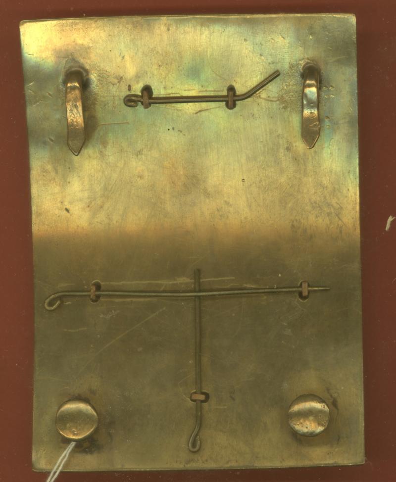 A fine scarce example worn circa 1850. Rectangular copper gilt back plate with silvered / white metal mounts comprising The Arms of Jamaica badge and motto, surmounted by gilt washed crown’ below. Two hooks and two studs to the reverse. VGC Renfrews bk1 166