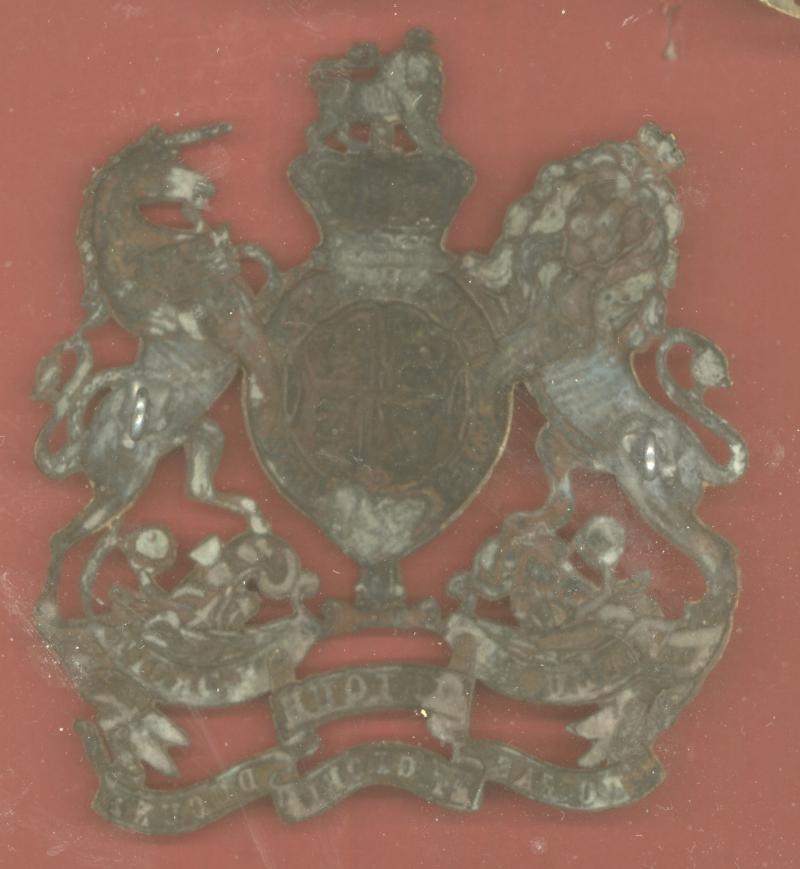 A good early die-stamped brass very finely fretted example comprising the Royal Arms , tri-part scroll below inscribed "Diet Et Mon Droit" with additional scroll to the bottom inscribed ''Quo fas et gloria ducunt''. Central scroll 'Ubique'. Two replacement loops to the reverse. GC