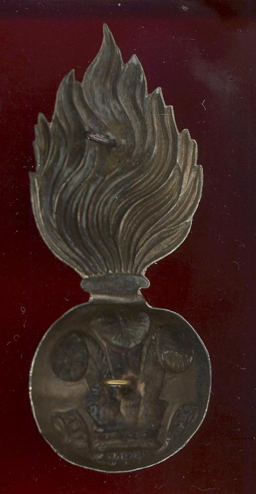 A fine scarce die stamped white metal example worn circa 1881-1908. Flaming grenade with Prince of Wales's plumes to the ball. Two long loops to the reverse. VGC.