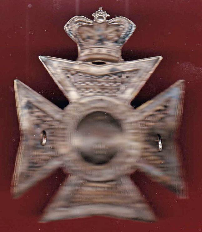 A fine scarce die stamped silver plated example worn circa 1861-1875. Crowned hobnail Maltese cross with raised edges , Criclet inscribed 'Prince Of Wales's Royal Regiment' with applied Prince of Wales's plumes to the centre. Two loops, one replacement to the reverse. VGC.