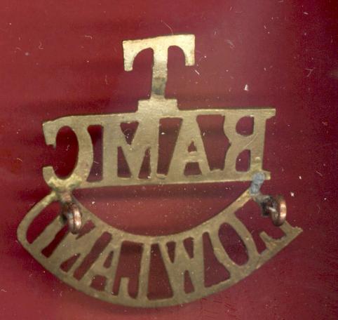 A good scarce brass Territorial Royal Army Medical Corps Lowland shoulder title. Two of three loops to the reverse. VGC.