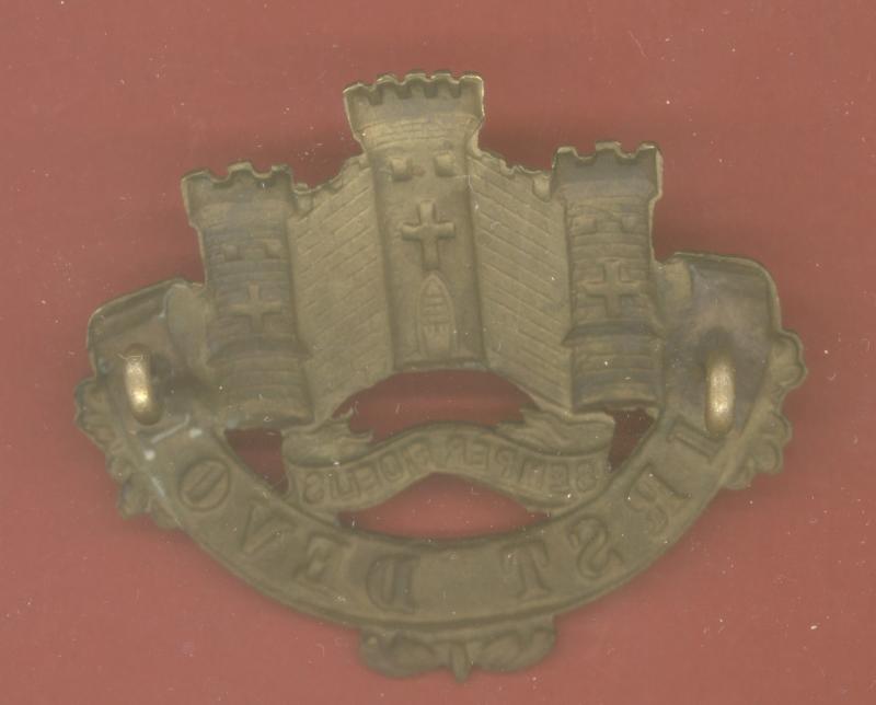 A fine scarce die stamped brass example worn circa 1874-81. Exeter Castle over ' Semper Fidelis' with 'FIRST DEVON' scroll below. Two brass loops to the reverse. VGC