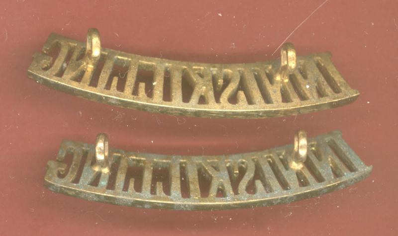 A fine scarce pair of thick gilt shoulder titles only worn circa 1920-1922. Two loops to the reverse of each title. VGC. Westlake 98