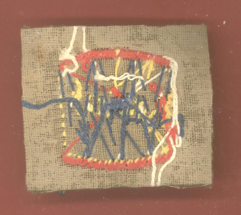 A good embroidered " Drake's Drum ", yellow drum with white ropes picked out in black , red bands top and bottom, central red diamond over blue square. All on a khaki rectangle. VGC