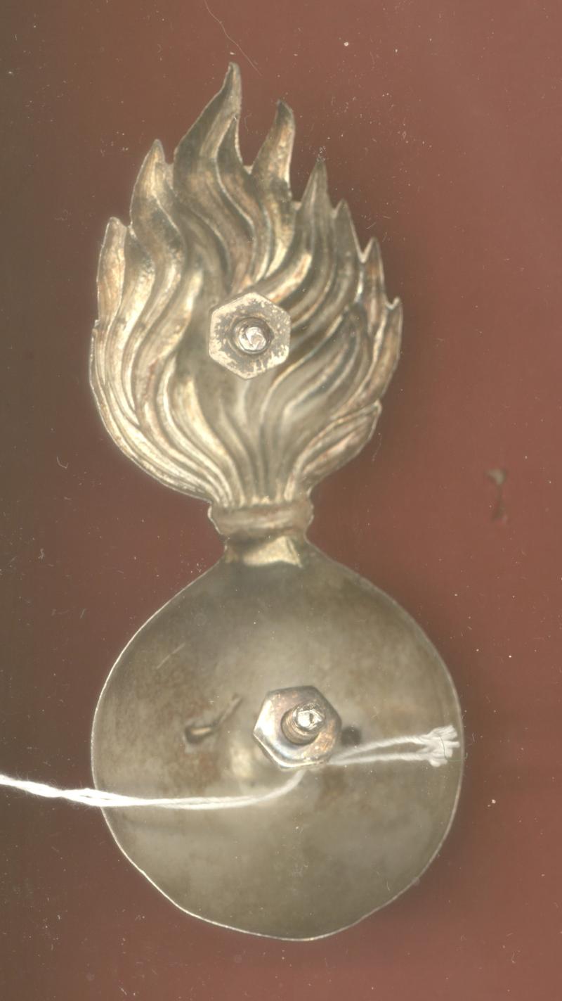 A fine and scarce Volunteer Battalion example. Die stamped silvered flaming grenade with Royal Arms in silver mounted to the ball. Reverse retains both original screw posts and nuts . One retaining wire missing from Arms otherwise VGC. As KK932.