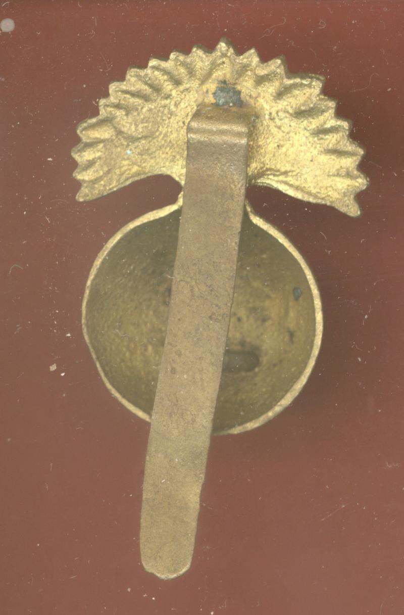 A good post 1934 Indian made die cast brass flaming grenade with white metal Inniskilling castle overlay flag flying to the right. Slider to the reverse . VGC