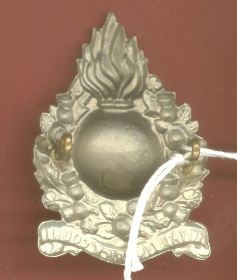 A fine scarce early die stamped white metal example. Within Union wreath of Roses, Thistles and shamrocks with fused grenade to the centre, 'ROYAL LIMERICK COUNTY' scroll to the bottom. Two loops to the reverse. VGC. KK 1287