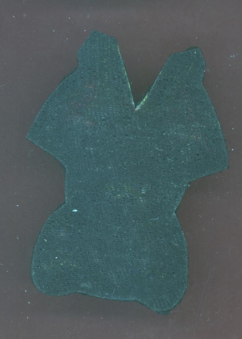 A good post 2014 1st issue Officer's beret badge. Padded grey wolf face set upon crossed lances with red over white pennons ,blank blue scroll across the lance butts. All on very dark green /black cloth backing. VGC.
