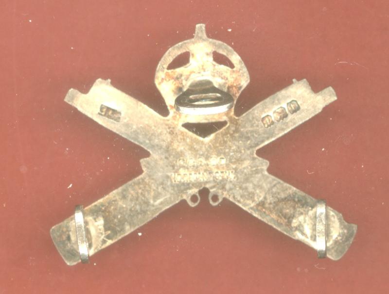 A fine scarce mid size pattern die cast hallmarked silver example. Crowned crossed Vickers machine guns. Bearing Birmingham hallmarks for 1918 (t) with makers stamp of B&P (Bent & Parker) also retailed by G&S.Co., 112 Regent Street (Goldsmiths & Silversmiths Company). Three silver lugs to the reverse. VGC