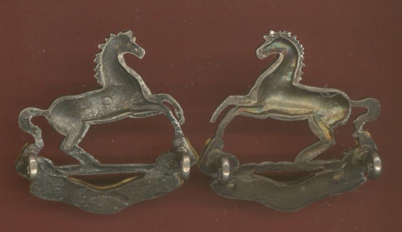 A good post 1926 near matching large pattern facing pair of Officer's dress collar badges. Silver plated horse with gilt title overlays . Two loops each to the reverse. Makers stamp J.R.Gaunt, London to one. VGC