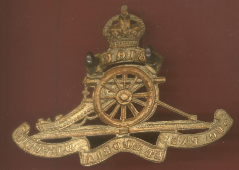 A fine scarce die-cast gilded example worn circa 1902-08. Crowned 'UBIQUE' scroll on gun with mounted wheel, resting on 'QUO FAS ET GLORIA DUCUNT' scroll; white metal 'M' mounted below the wheel. Two loops to the reverse. VGC
