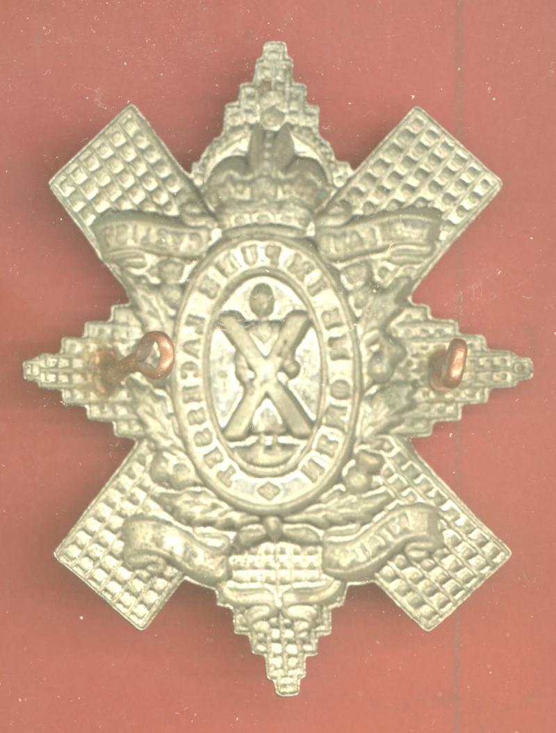 A fine scarce die stamped white metal example worn circa 1909-19. Same design as Black watch but scroll inscribed 'Highland Cyclist Battalion T. F.' . Two loops to the reverse. VGC.