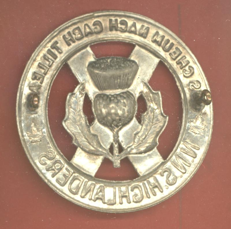 A fine ultra scarce post 1941 die stamped white metal example with 'N.N.S. HIGHLANDERS' . Two loops to the reverse. Makers stamp W.Scully, Montreal. VGC