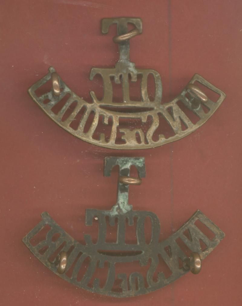 A good scarce pre 1932 brass Inns of Court Regiment shoulder titles. Three loops to the reverse of each. GC.