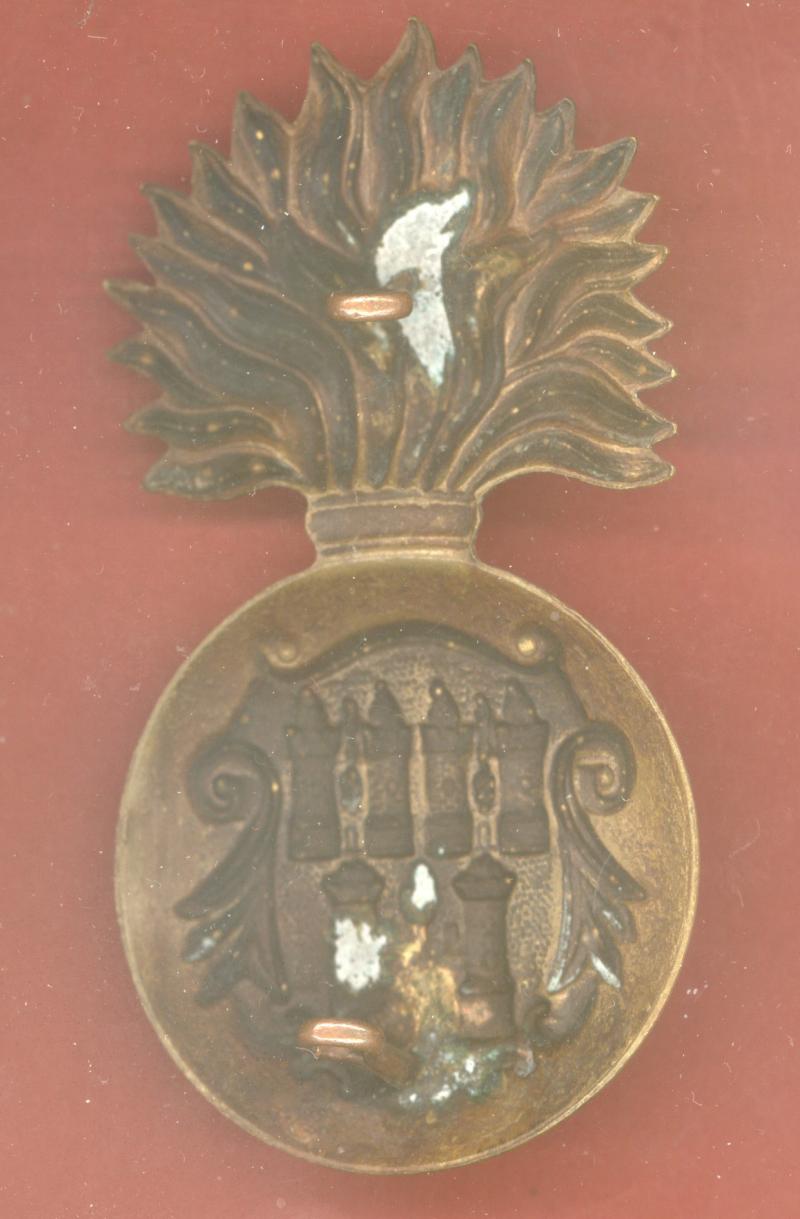 A good scarce die stamped brass example worn circa post 1881.Flaming grenade with The Arms of the City of Dublin to the ball . Two toned loops to the reverse. VGC. KK 972