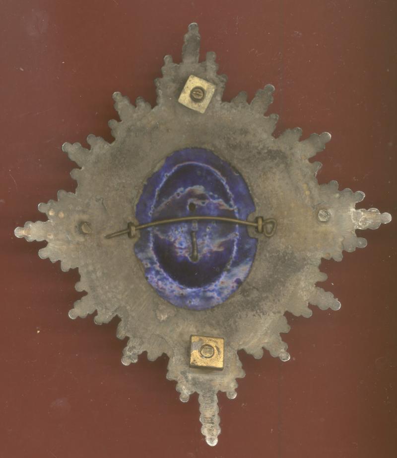 A fine scarce Officer’s Helmet Plate worn circa 1871, silvered beaded star, to the centre voided gilt Garter strap on blue enamel , silvered Royal Cypher on red enamel ground. Four screw posts and nuts to the reverse. VGC