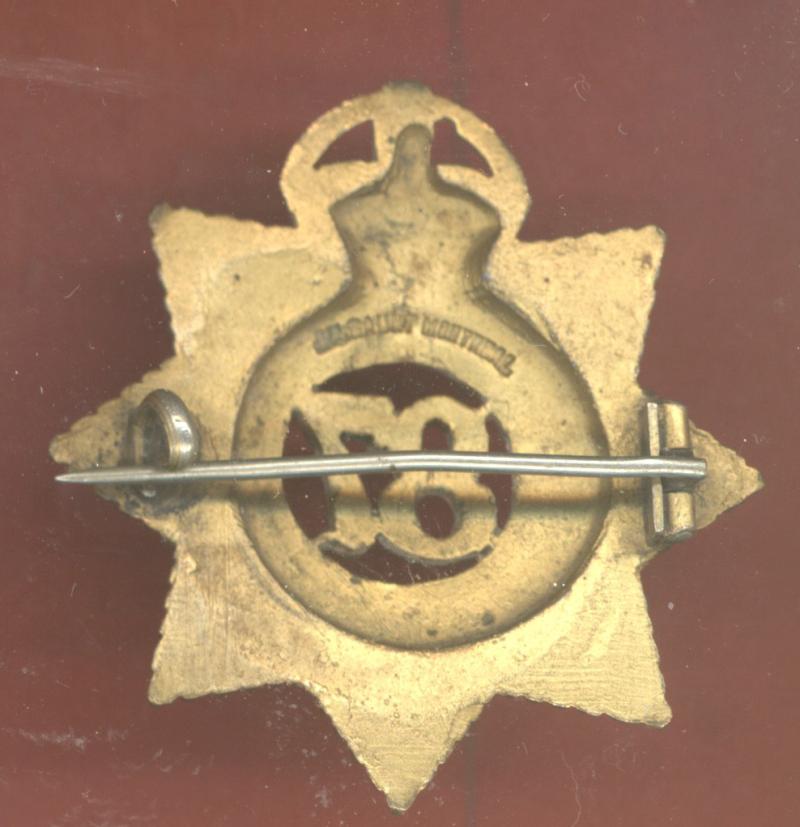 A fine scarce British made die-cast gilt example . Crowned 'PUNJABIS' circlet resting in eight point star; 76 to voided centre. Pagri pin to the reverse. Makers stamp J.R.Gaunt, Montreal. VGC Sowars & Sepoys 792