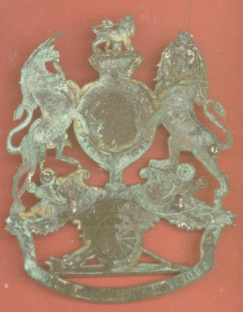 A fine early die-stamped gilded example worn circa 1881-1901. Royal Arms, unvoided around the shield, with scroll beneath inscribed 'Ubique' over a gun, resting on a scroll inscribed 'Quo Fas Et Gloria Ducunt'. Two of three loops to reverse. General service wear GC.