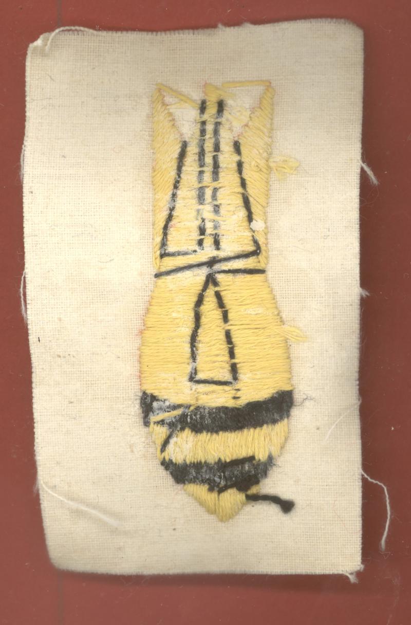 A fine scarce embroidered yellow bomb with black detail on red felt rectangle. VGC
