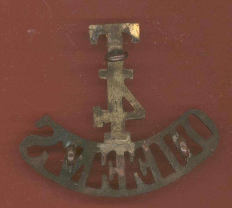 A good scarce brass Territorial shoulder title to the 4th Battalion , The Queen's Royal West Surrey Regiment. Three loops to the reverse. VGC. Westlake 737