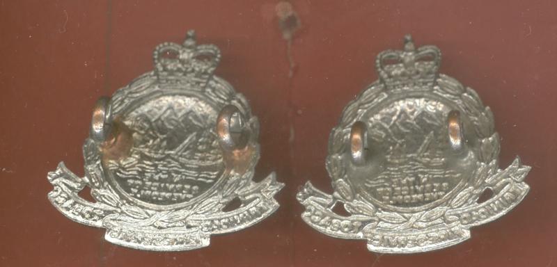 A fine post 1953 die stamped chrome metal pair. Crowned laurel wreath with two sailing ships and harbour on sea, mountains and sky behind . Two loops to the reverse of each collar. VGC.