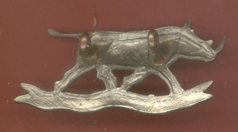 A fine super scarce die cast white metal example. Rhino on 'EQUATORIA' scroll. Two loops to the reverse. VGC. Renfrews 1340