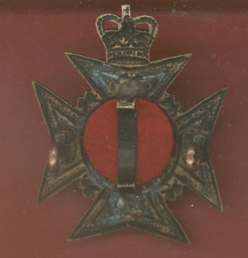 A good scarce die stamped blackened brass example worn circa 1957-1972. Two loops and red felt backing to the reverse. VGC. Owen 2989