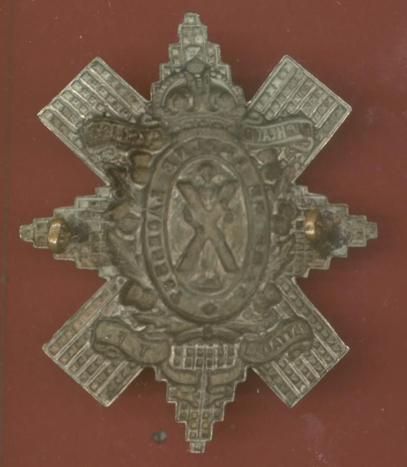 A fine scarce die stamped white metal example worn circa 1909-19. Same style as Blackwatch but scroll inscribed 'Highland Cyclist Battalion T. F.' . Two loops to the reverse. VGC.