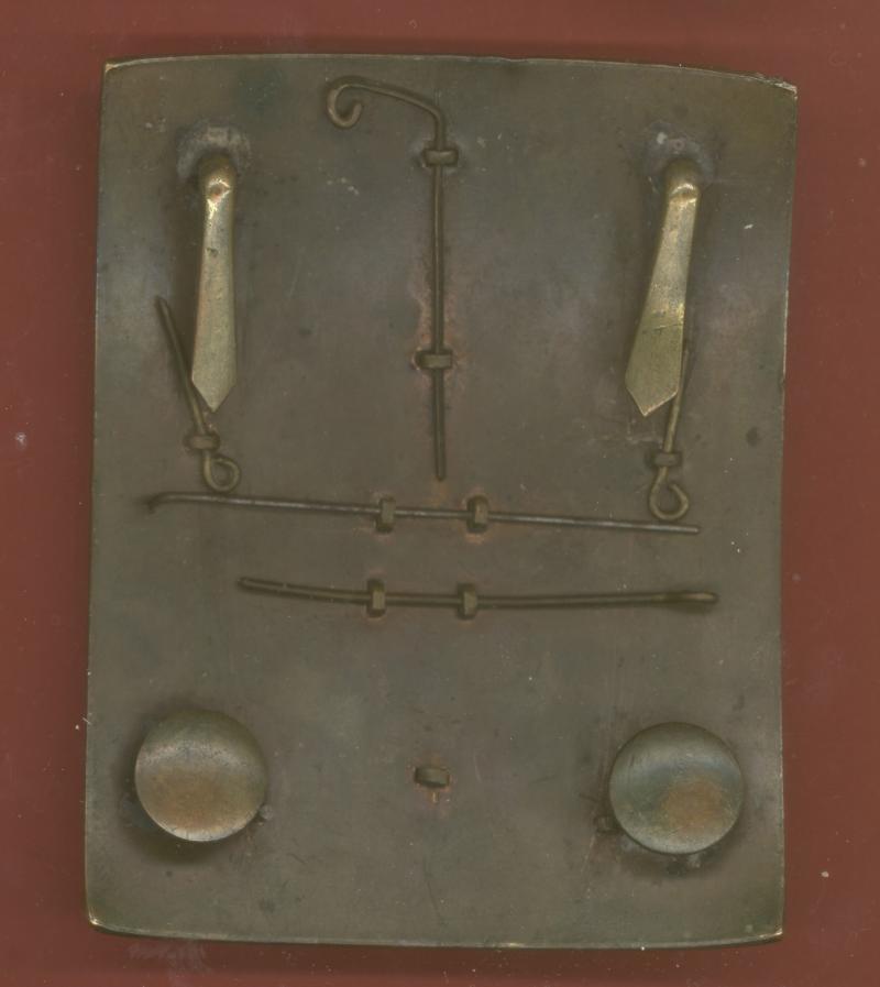 A fine scarce example worn circa 1830-55. Rectangular copper gilt back plate with silver mounts comprising the Prince of Wales’s badge and motto, floriated ’77’ and laurels sprays with ‘Peninsula’ below. Two hooks and two studs to the reverse. Gilt very worn to backing plate. GC