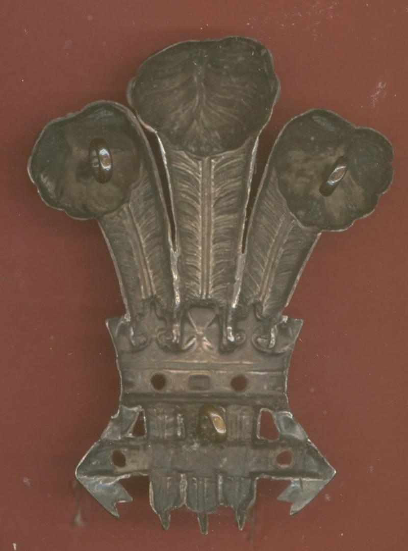 A fine scarce large die stamped silvered metal Officer's forage cap badge worn circa 1881. Three loops to the reverse. Missing gilt overlay to coronet and scroll hence price . GC 67mm high