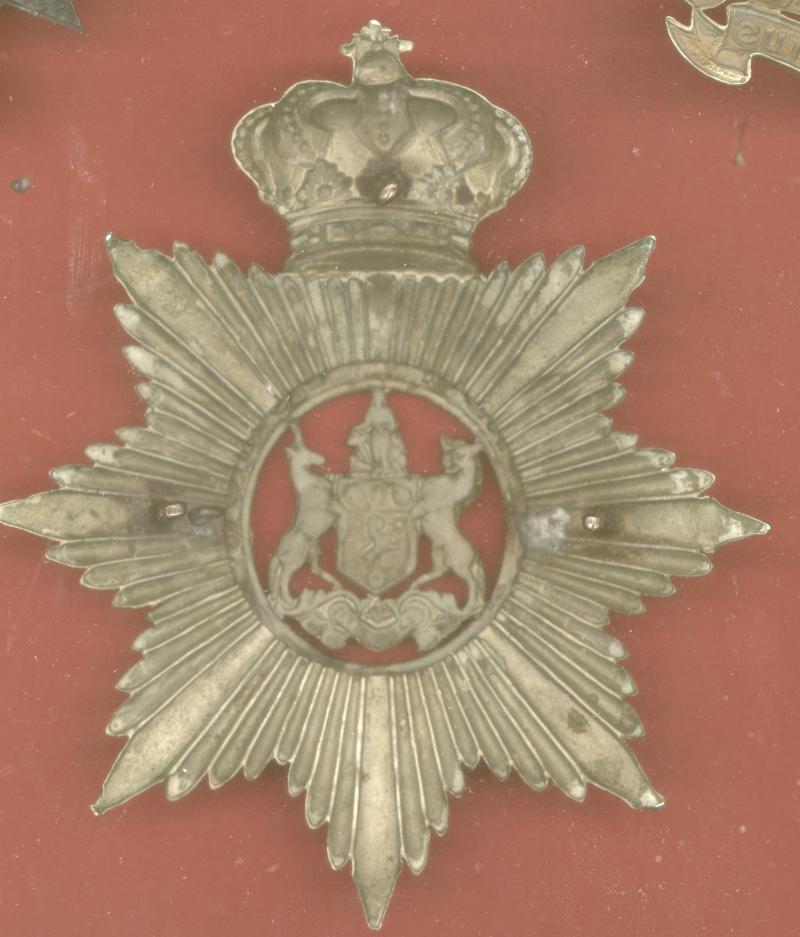 A fine scarce two part construction die stamped white metal example worn pre 1899. Crowned eight point star with circlet inscribed 'Diamond Field Horse 1877', Arm's of South Africa to voided centre. Three toned loops to the reverse. VGC. Owen 182