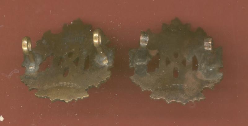 A good scarce die cast pickled copper matching pair of collar badges. Two loops to the reverse of each collar. Makers stamp D.A. Reesor to both. VGC.