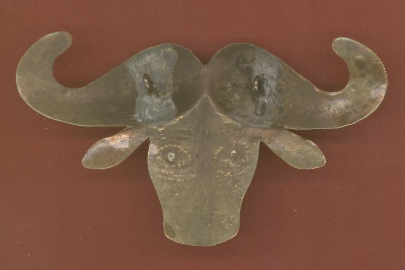 A super scarce very large hand cut and hand engraved copper/ brass Water Buffalo head. Worn as helmet plate / Drum Strap Ornament. Two soft soldered loops to the reverse. VGC. 65mm high x 112mm wide. Renfrews 1291