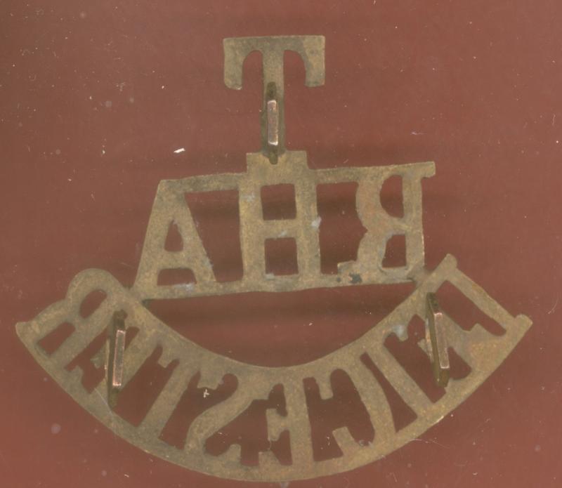 A super scarce Royal Horse Artillery brass shoulder title worn by the Leicestershire Territorial Battery Royal Horse Artillery circa 1908-19. Three hex type lugs to the reverse. VGC. Westlake 591