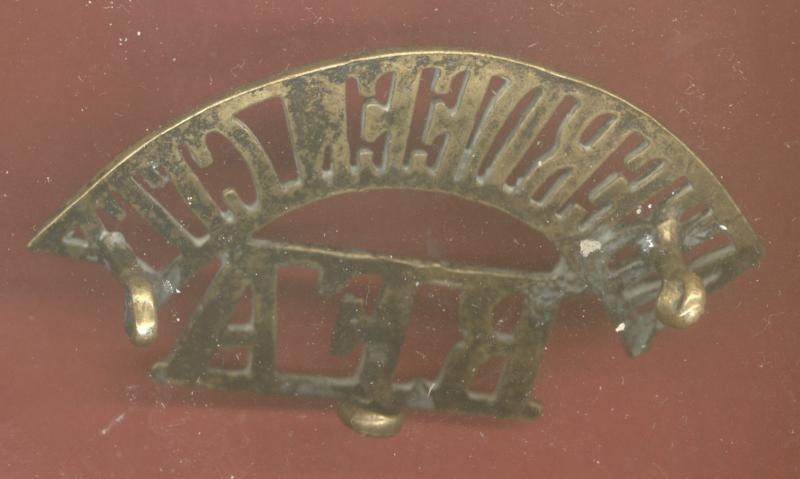 A fine scarce brass shoulder title circa 1908 to the 1st Highland Brigade, Royal Field Artillery. Three loops to the reverse. VGC,. Litchfield 347